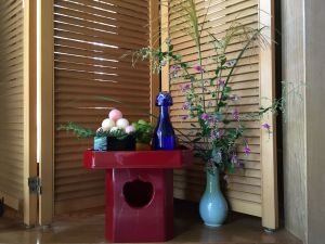 この日には、月見団子(当地では芋名月に因んでういろう生地の芋型団子)等を供え、秋の七草のハギとススキなどを飾り、月をまつるのが習いとなっているようです。(宴のお酒も…)