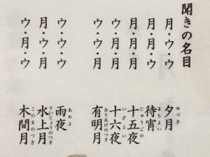 ウ・ウ・ウの説明のところで、意味として月が見えない「新月」の名目となるところを「雨夜」としたところに妙がある旨のお話があり、いたく感心しました。(上記、聞書の名目順は並べ替えてあるようです)