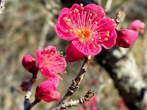 公園では早咲きの梅「紅珊瑚」が見頃、はぼほぼ満開の状態です。