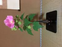 床には首が細長い曽呂利の花入れを真塗りの「曽呂利盆」に置いて、芙蓉の花を入れました。